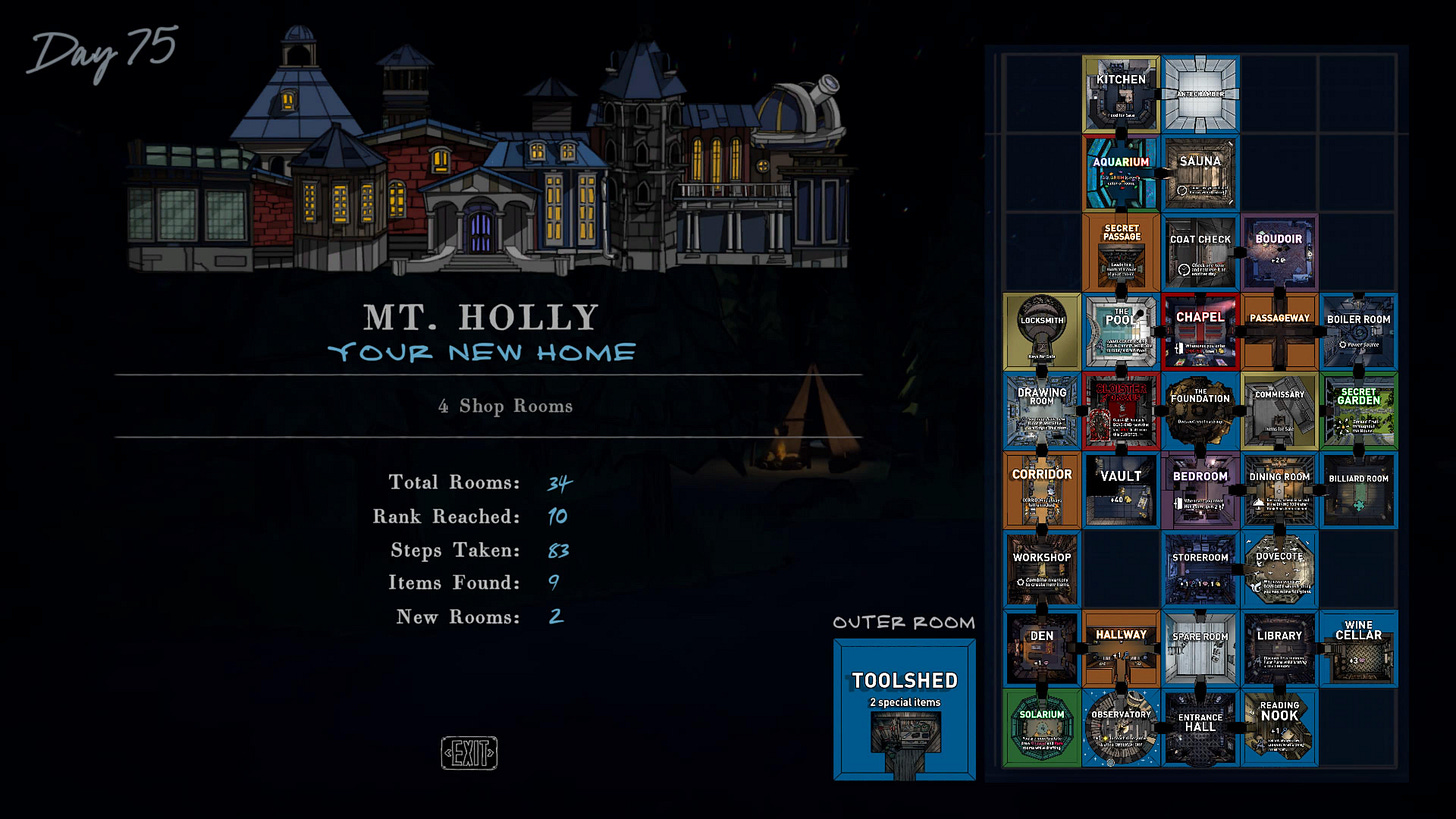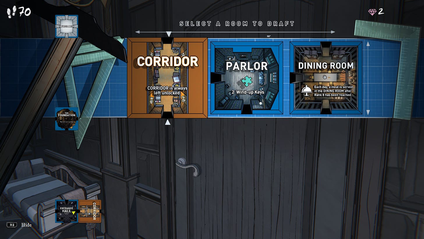 Whenever you reach a door, you draft up three blueprints for rooms. Some hold puzzles or bonuses, others offer utility to your house, few have multiple doorways, there's also several that are dead ends. Mt Holly is always set on a nine by five grid, giving you some limitations for drafting. Each choice is crucial, as the way you plot your house affects both your progress in the game and what you'll be able to get out of each run.