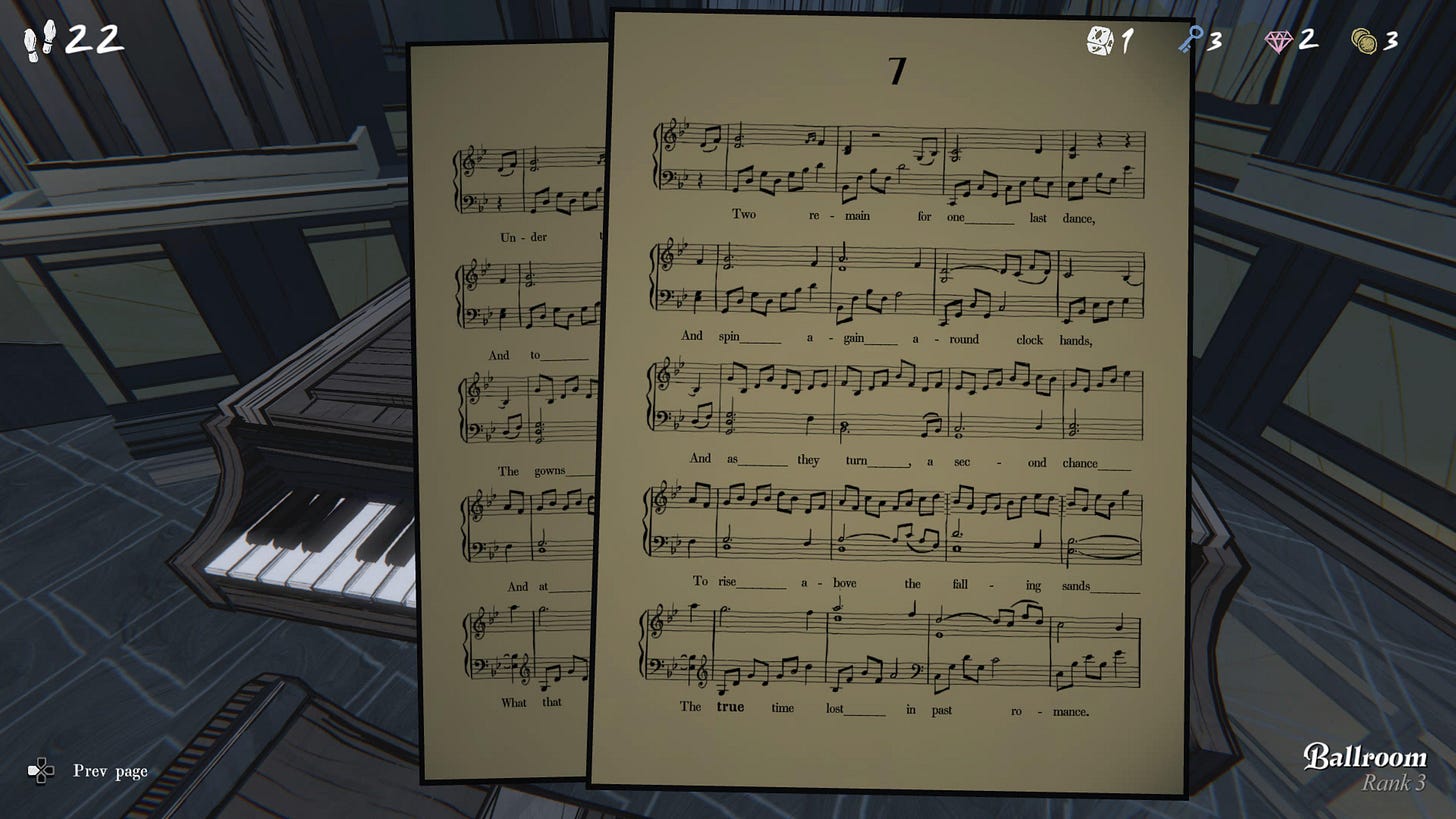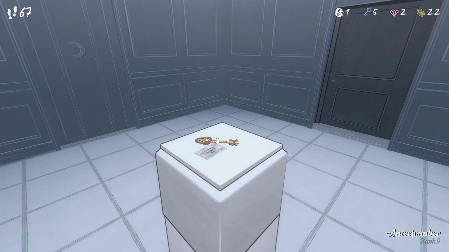 The run that did get me into Room 46 left little to chance. I knew exactly what I was doing. That piano music resurfaced, and this time it felt like a victory lap. I cleanly marched into Room 46 with plenty of steps to spare and an abundance of keys and gems.